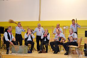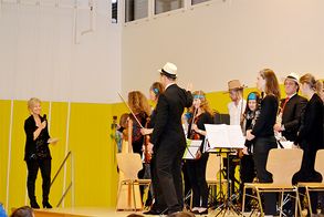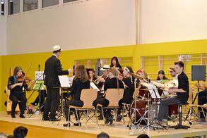 Nach diesem sehr eindrücklichen Einstieg begaben sich die Gäste in die Turnhalle, wo bereits das Lehrerorchester aufwartete. Passend gekleidet erinnerten sie mit bekannten Stücken aus den 70-er Jahren an die Zeit, als die Musikschule der Seegemeinden entstanden ist.